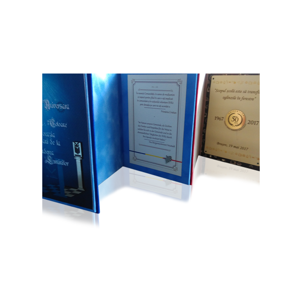 Placheta cuprinde insert Abs la dimensiunile 97 x 147 mm gravat , diploma tiparita pe carton special si incao mica gravura complementara, pentru un efect special